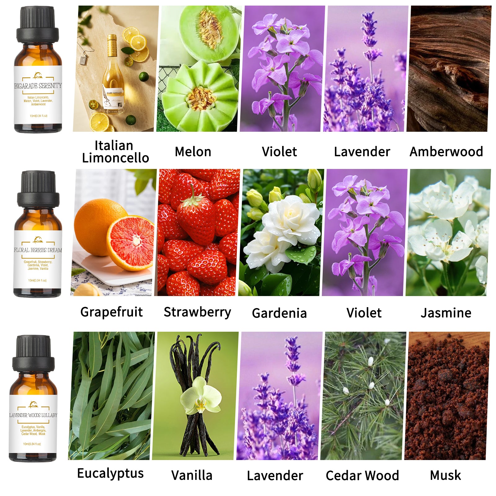 Sweet Dreamscape Set includes 3 blend oils : Bigarade Serenity (Key Notes: Italian Limoncello, Melon, Violet, Lavender, Amberwood), Floral Berries Dream (Key Notes: Grapefruit, Strawberry, Gardenia, Violet, Jasmine, Vanilla), and Lavender Woods Lullaby (Key Notes: Eucalyptus, Vanilla, Lavender, Ambergris, Cedar Wood, Musk);